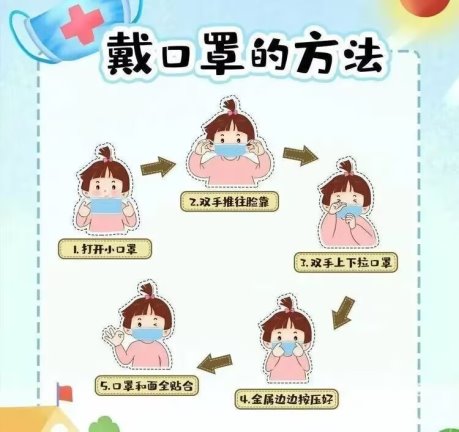 小朋友们,戴口罩时把口罩鼻夹朝上,深色面朝外,上下拉开褶皱,将口罩覆盖口、鼻、下颌,金属条捏一捏,压紧鼻夹密封条。适当调整,使口罩充分贴合面部。