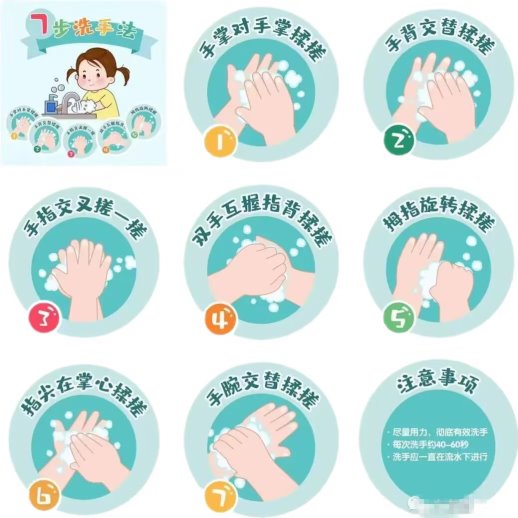 小朋友们,要减少接触公共场所的公共物品和部位,从公共场所返回后、咳嗽用手遮挡后、饭前便后、处理生肉产品后、接触门把手或电梯按钮后,应该照“七步洗手法”,用洗手液或香皂洗手。