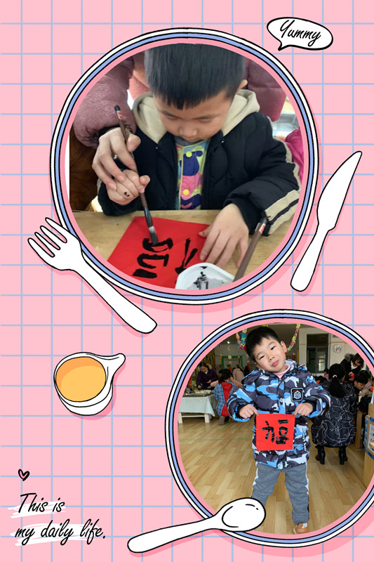 孩子们拿起毛笔,蘸上墨汁,一笔一划的画着“福”字,代表着对新年的美好祝愿!看着他们认真专注的稚嫩脸庞,十分可爱。